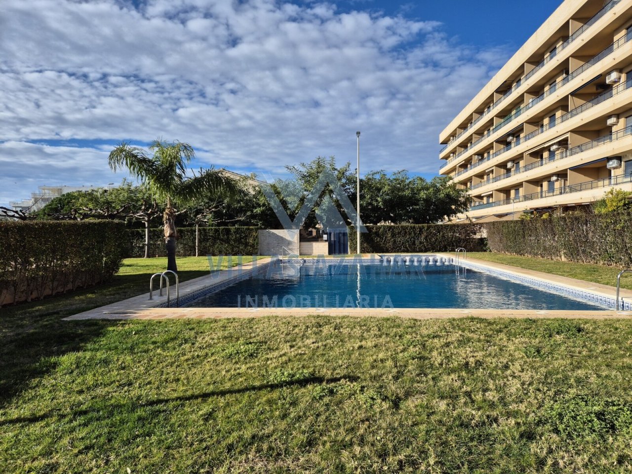 En face de l’immeuble se trouve un espace commun avec grande piscine et espaces verts soigneusement entretenus.